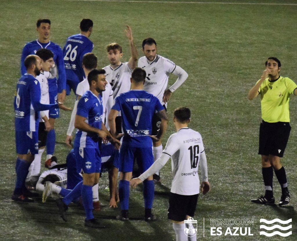 Intentó el Benidorm estirar líneas, pero el equipo local ejerció mucha presión y, con la ayuda de su afición que no pararon de empujar y animar a sus jugadores, no consiguieron quitarse el dominio del equipo local. Así, en el minuto setenta y nueve, el CF Benidorm sufre la expulsión de Pato por doble amonestación, quedando los benidormenses con diez jugadores sobre el terreno de juego.